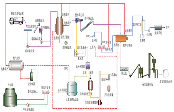 圖1:控制系統(tǒng)網(wǎng)絡(luò)結(jié)構(gòu)圖 按照工廠生產(chǎn)要求,垃圾處理廠的整個(gè)PLC控制系統(tǒng)將被分為上位監(jiān)控站、PLC控制柜、MCC柜(電機(jī)控制中心)、現(xiàn)場(chǎng)控制柜/箱三部分組成。監(jiān)控站主要起到人機(jī)配置監(jiān)控作用,在監(jiān)視屏幕上顯示的生產(chǎn)工藝流程圖,啟動(dòng)和停止控制裝置,選擇自動(dòng)/手動(dòng)操作狀態(tài),PLC自動(dòng)控制啟動(dòng)和停止,或直接對(duì)現(xiàn)場(chǎng)設(shè)備手動(dòng)操作的控制命令,并保存運(yùn)行過(guò)程中產(chǎn)生的數(shù)據(jù)生成運(yùn)營(yíng)數(shù)據(jù)趨勢(shì)曲線,顯示警報(bào)信號(hào)。監(jiān)測(cè)站配備一個(gè)UPS電源,確保系統(tǒng)在緊急斷電時(shí)能夠有足夠的停電運(yùn)行能力。PLC控制柜的作用是現(xiàn)場(chǎng)的開(kāi)關(guān)和模擬信號(hào)的采集和控制,其中CPU、電源和相應(yīng)的I/O模塊均由PLC控制器控制,它可以很容易地?cái)U(kuò)展操作和系統(tǒng)維護(hù), MCC柜主要用來(lái)放置空氣開(kāi)關(guān),交流接觸器和其他低壓電器。現(xiàn)場(chǎng)控制柜以及PLC通過(guò)MCC控制現(xiàn)場(chǎng)設(shè)備,F(xiàn)場(chǎng)控制柜/箱可現(xiàn)場(chǎng)手動(dòng)操作,可直接驅(qū)動(dòng)MCC柜,一般狀況下不使用,在裝配和調(diào)試或PLC出了問(wèn)題時(shí),可以做應(yīng)急之用。 工藝流程圖及系統(tǒng)實(shí)現(xiàn)功能 垃圾處理的步驟主要可以分為如:分揀、加熱、蒸煮壓榨、固態(tài)分離、離心分離、烘干等多個(gè)加工程序。整個(gè)過(guò)程分在預(yù)處理車(chē)間、油脂車(chē)間、生物蛋白飼料車(chē)間、污水處理車(chē)間以及廢氣處理等幾大部分進(jìn)行。